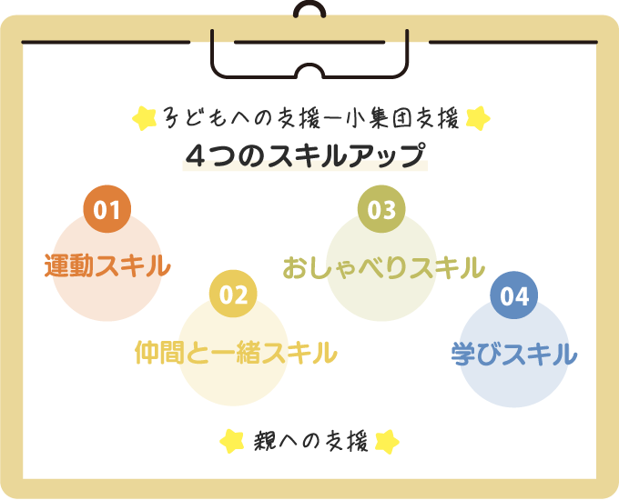 未就学児(小学校未満)の発達段階を見極め、親子の信頼関係(社会性の始まり)を築き、発達の支援を行います。